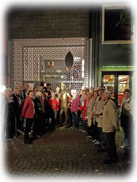 Bei der anschließenden Nachtwächterführung erläuterte Herr MacNeille die Aufgaben der Nachtwächter. Im Mittelalter ging er bei Dunkelheit mit seiner Laterne von Haus zu Haus und prüfte, ob die Haustüren abgeschlossen waren, die Bewohner die Kerzen gelöscht hatten und schliefen. Zu jeder vollen Stunde rief er: Liebe Leute lasst Euch sagen.. Sie sorgten auch dafür, dasssich kein „Gesindel“ herumtrieb. Vom Dom führte uns der Weg durch kaum beleuchtete Straßen. An besonders dunklen Ecken erzählte er uns manch gruselige Geschichte. Auf dem Weg kamen wir an Tünnes und Schäl und den `Heinzelmännchen´ von Köln vorbei. Der Rundgang endete am „Alter Markt“.