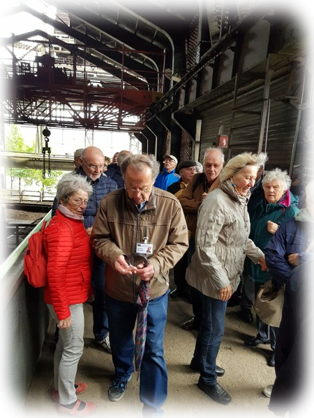Bei der Führung in zwei Gruppen unter Leitung von Christian Scholz und Helmut Bretfeld erfuhren die Teilnehmer im Landschaftspark beim Erklimmen des Hochofen-Turms Nr. 5 über eine eiserne Treppe auf 70 m Höhe auf die heutige Besucherplattform und beim Besichtigen der Kraftzentrale im Hauptschalthaus viel über die Verhüttung von Eisenerz zu Roheisen.